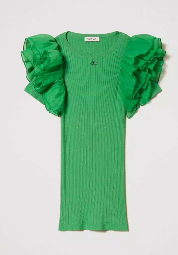 Abito corto fitted in misto viscosa con logo in metallo davanti, maniche corte con balze in organza,...