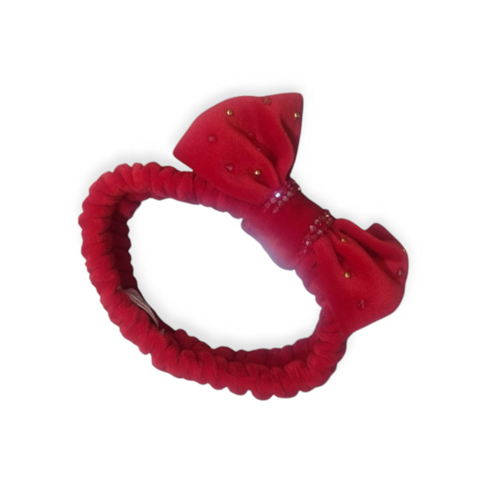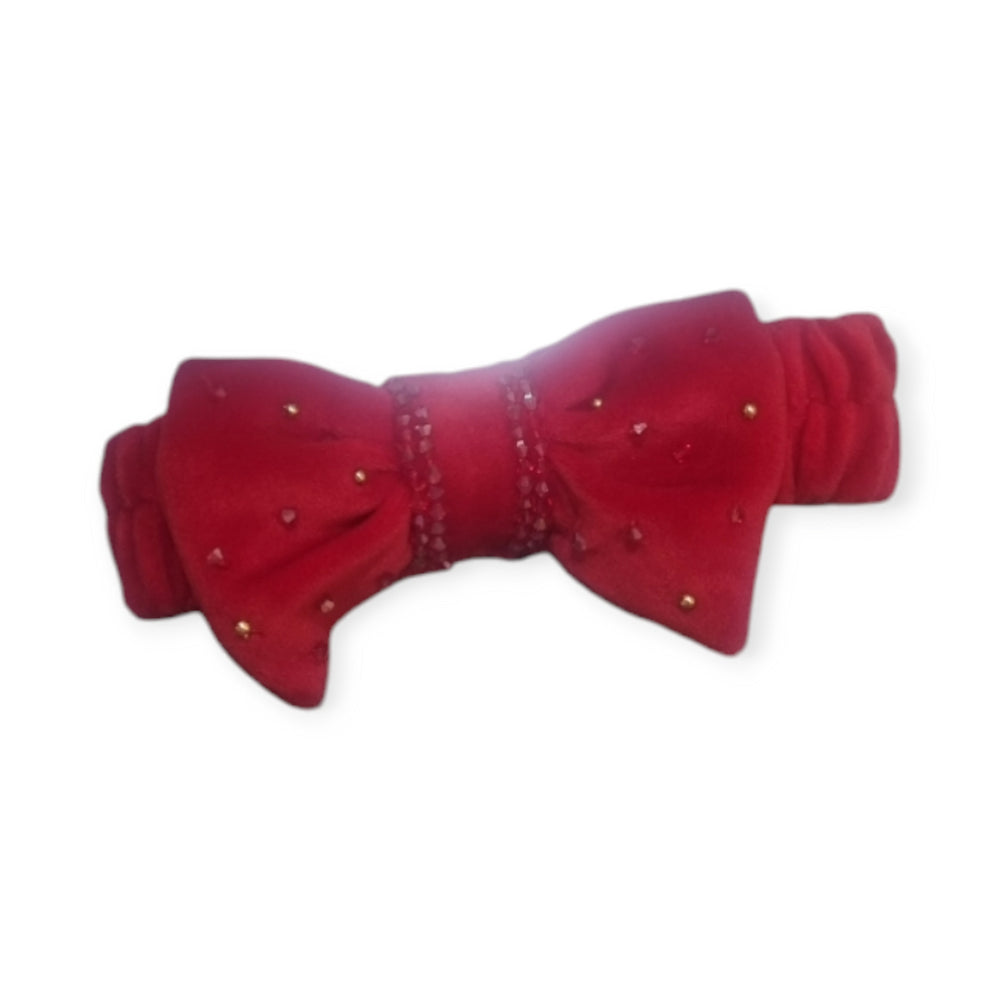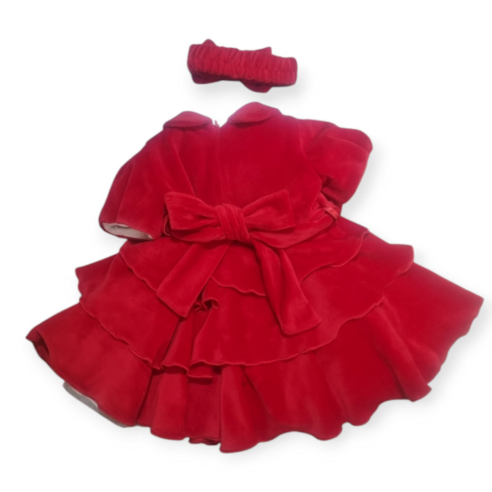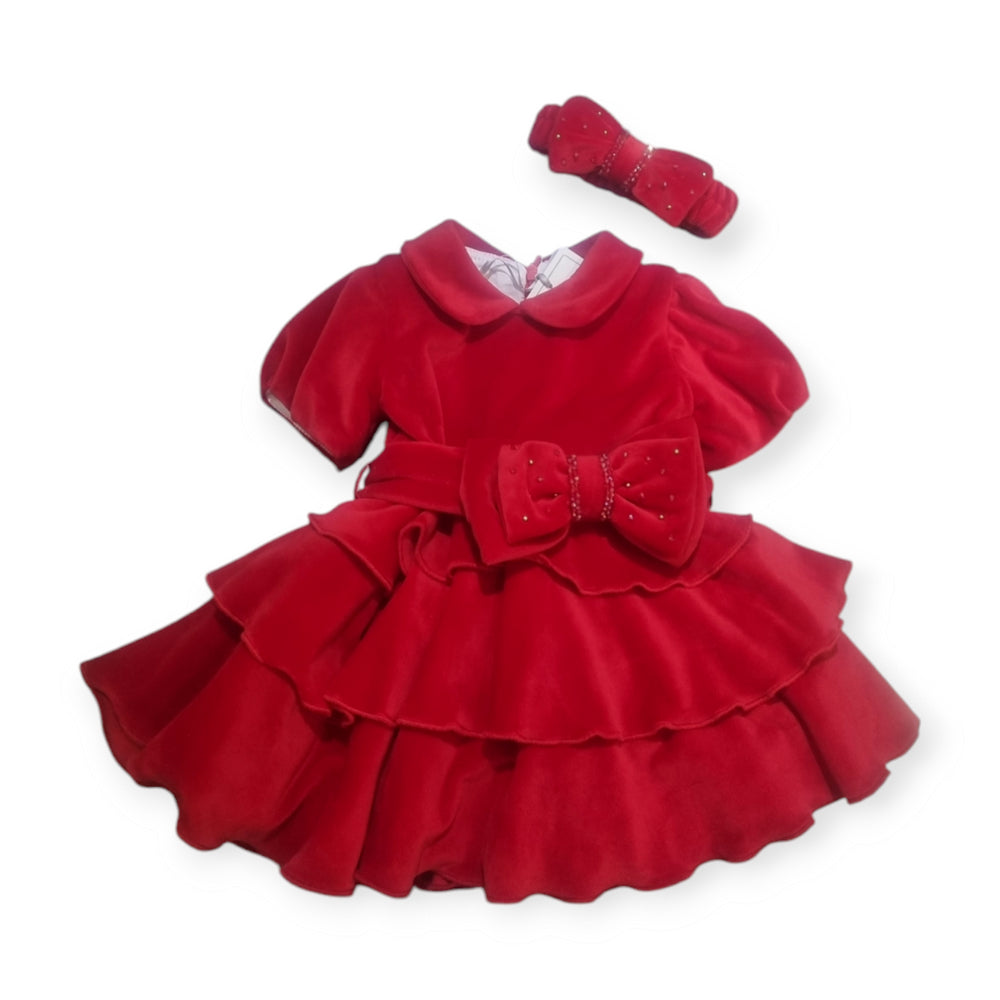 Abito in velluto rosso a balze con tulle all'interno e cintura con fiocco e brillantini. Fascia testa...