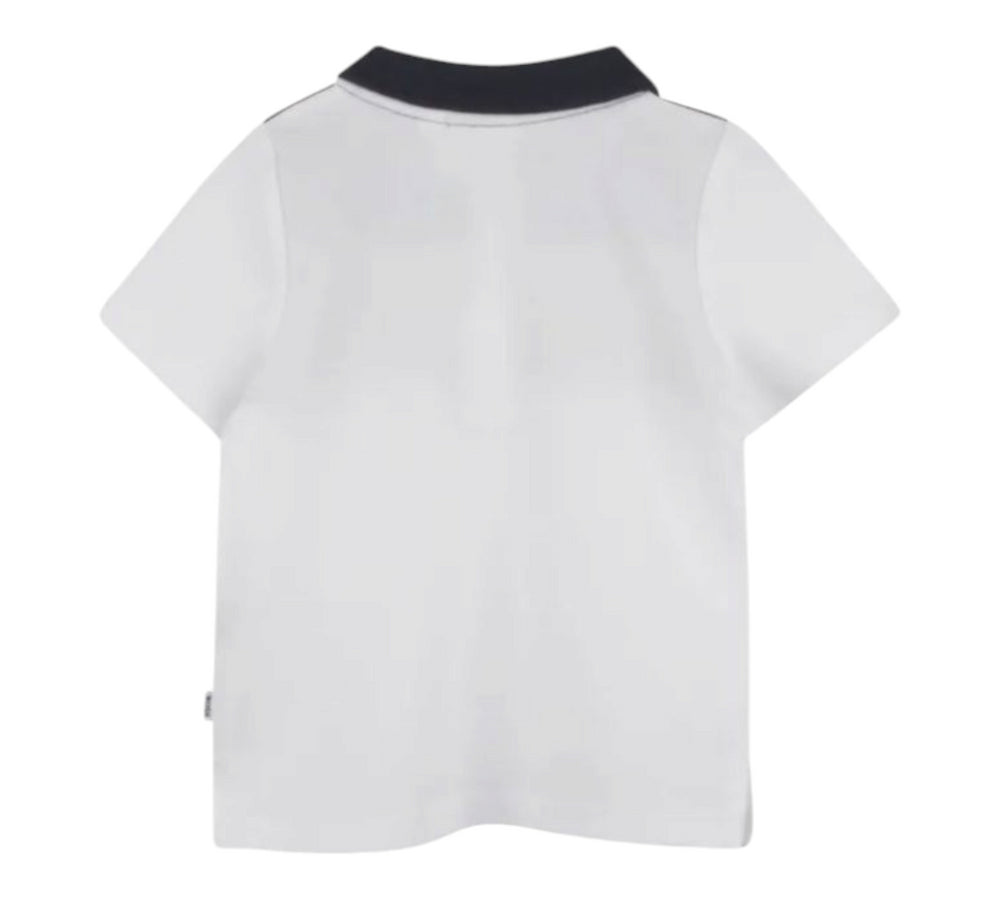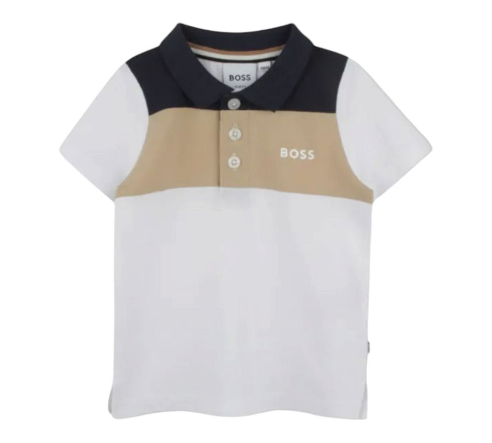 Polo tricolore blu,beige e bianco con logo stampato.Boss.